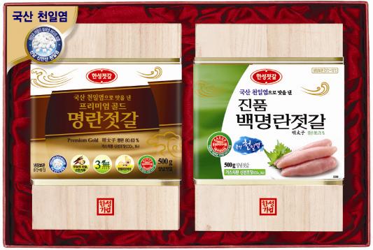한성기업의 대표적인 선물세트는 역시 젓갈 선물세트로, 엄선한 원료를 이용한데다 특유의 노하우인 빙온숙성 공법을 이용해 정갈한 맛이 난다. 무농약 고춧가루, 마늘, 천일염을 사용한 프리미엄 골드명란과 진품백명란, 카라시멘타이코 타입의 일본풍 프리미엄 명란을 급속 동결해 신선함을 유지한 저염명란 명품세트, 키토올리고당이 들어있는 골드 명란·창란·오징어젓갈 등이 있다.